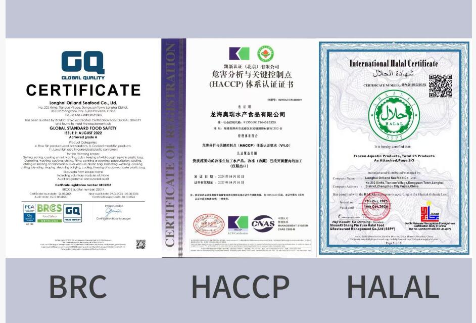 The factory is certified with HACCP, BRC, HALAL and FDA, which guarantees product quality and safety and fully meets international export standards.